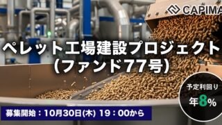 こんにちは!管理人まさおです。まさお貸付型CFの「CAPIMA(キャピマ)」で10月30日(木)19時から新ファンドが募集開始の予定です!今回募集される「ペレット工場建設プロジェクト(ファンド77号)」の主な募集条件はこちら。 募集金額:3...