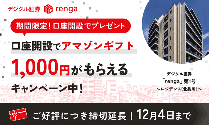 なおrengaでは11月30日(日)まで口座開設キャンペーンが実施されていましたが、これが12月4日(木)まで延長されました!