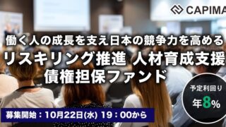 CAPIMA 「メディアタイアップキャンペーン」実施中!キャンペーン実施中のこのブログからの新規口座開設完了でAmazonギフト券1,500円分、さらに同期間中の20万円以上の投資確定でAmazonギフト券2,000円分がプレゼントされます。 詳細ページへ 公式ページへ
