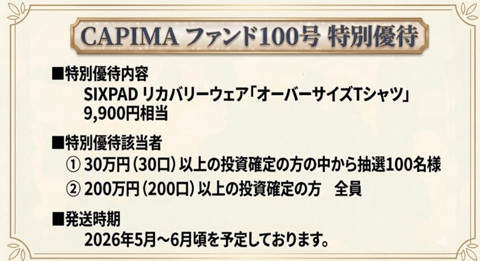 今回はタイトルの通り、CAPIMAで募集された100号記念ファンド。