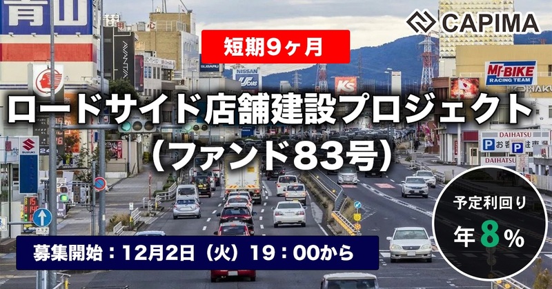今回募集される「【短期:9ヶ月】ロードサイド店舗建設プロジェクト(ファンド83号)」の主な募集条件はこちら。