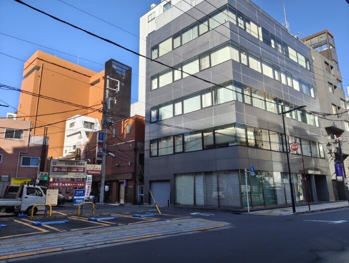 ご覧の通り駐車場があり、その右側に5階建ての建物(Hf湯島ビルディング)、そして奥に8階建ての建物(ガーベラ天神ビル)があります。