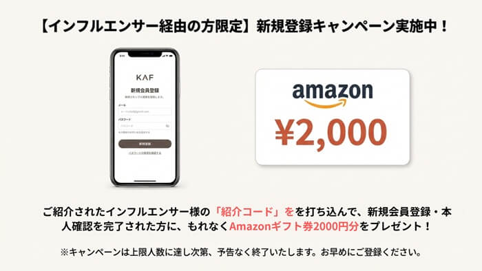 なおKAFでは現在、新規登録で2,000円分のAmazonギフト券が貰えるキャンペーンを実施中です!