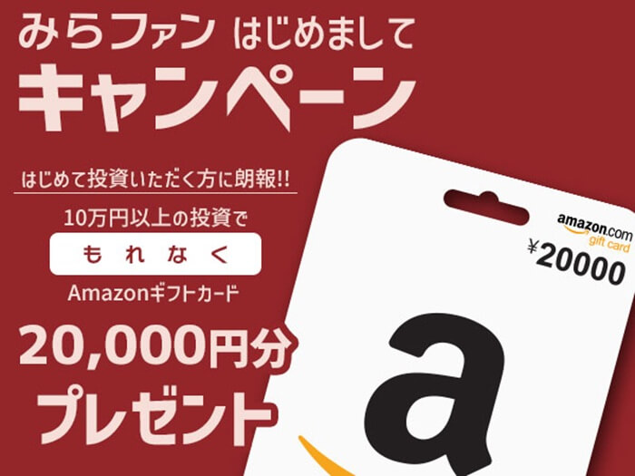 なんと「はじめてみらファンに投資いただけた方限定で、Amazonギフトカードを20,000円分プレゼントする」キャンペーンとのこと。