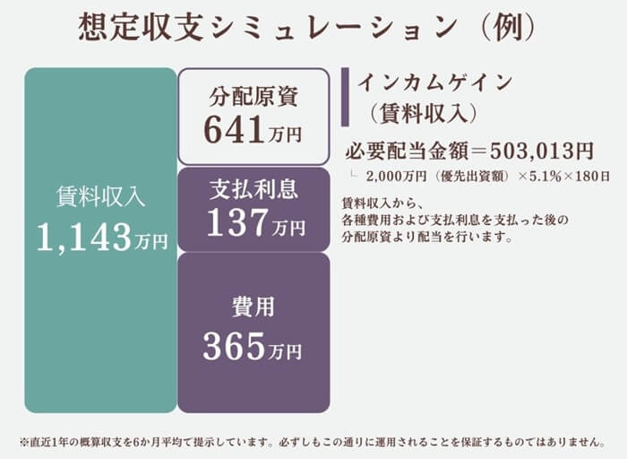 今回の投資対象物件から期間中に1,143万円の賃料収入がある予定で、そこからファンドの分配原資に利用できる部分は641万円とのこと。