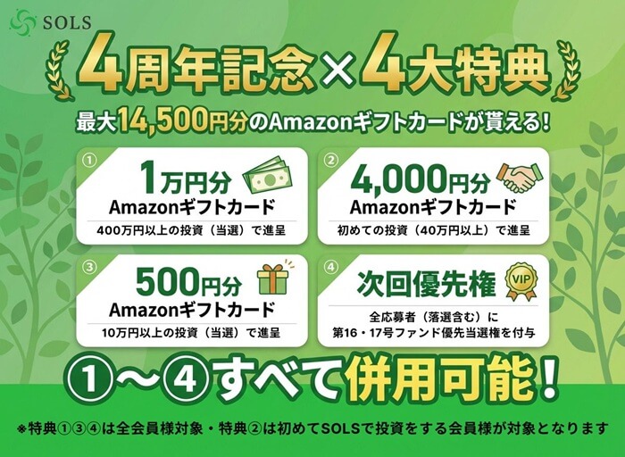 今回募集される「SOLS第15号案件:4周年記念ファンド」の主な募集条件はこちら。