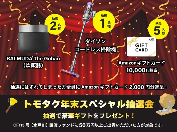 今回のファンドに50万円以上の投資を行うことが条件ですが「トモタク年末スペシャル抽選会」として各種商品の抽選プレゼント企画があります。