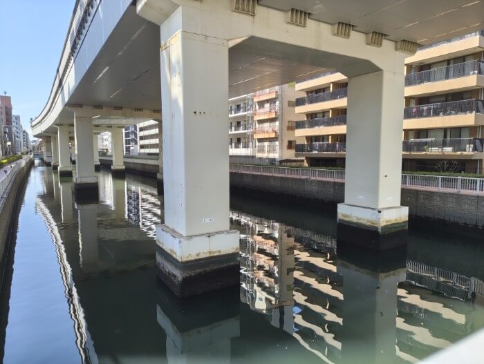 上を走るのは首都高小松川線、そして下を流れるのは竪川という運河のようです。