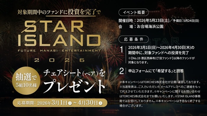 そして2つ目は初回かに関わらず4月30日(木)までの投資完了と申込みで狙える【STAR ISLAND 2026】チェアシートのプレゼント。