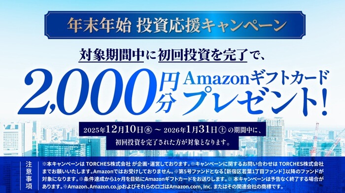 2026年1月31日(土)までの間に第5号以降のファンドで初回投資完了するとAmazonギフト券2,000円分が貰えるキャンペーンが実施中です!