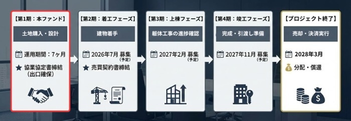 今回のファンドの投資対象物件は本来、売却完了まで27ヶ月のプロジェクト期間となる予定とのことです。