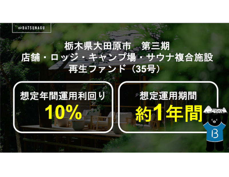 栃木県大田原市 第三期 店舗・ロッジ・キャンプ場・サウナ複合施設再生ファンド【抽選式】