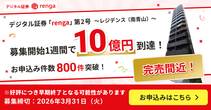 なおrengaでは3月31日までの予定で「デジタル証券「renga」第2号 レジデンス(南青山)」ファンドの募集を行っています。